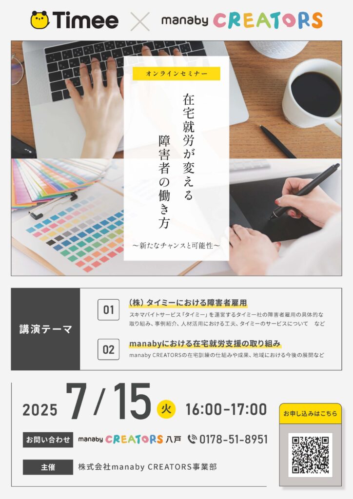 就労継続支援B型事業所 manaby CREATORS は、青森県初となる「manaby CREATORS 八戸」の開設を記念し、地域の障害者支援関係者および行政関係者向けにオンラインセミナーを開催します。