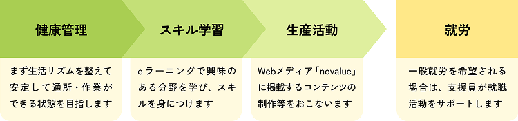 まずは、現在の状況や将来の希望を支援員に相談しながら、一人ひとりに合わせて計画を立てていきます。通所に不安がある方は体調・生活リズムを整えることから始められます。